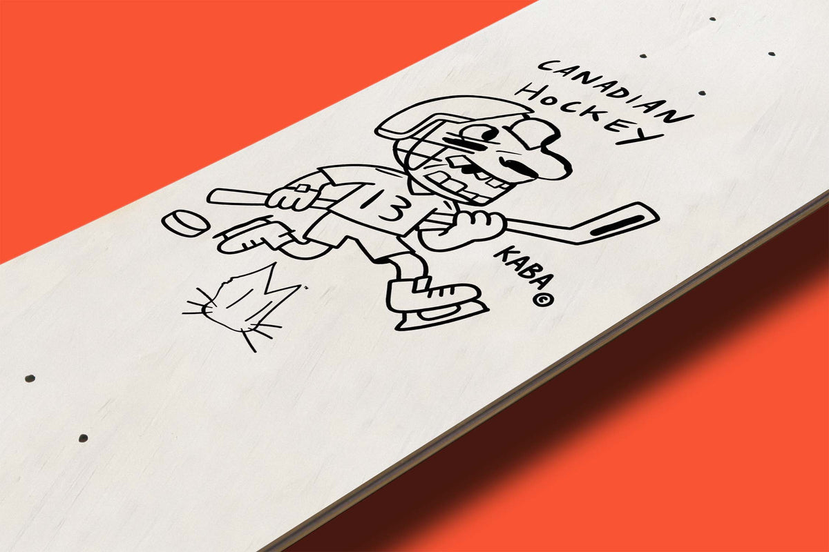 Made in Tokyo, Japan. Hand-painted skateboard deck on Canadian maple. White background with character artwork centered, acrylic with a matte finish. Designed for skating or display.