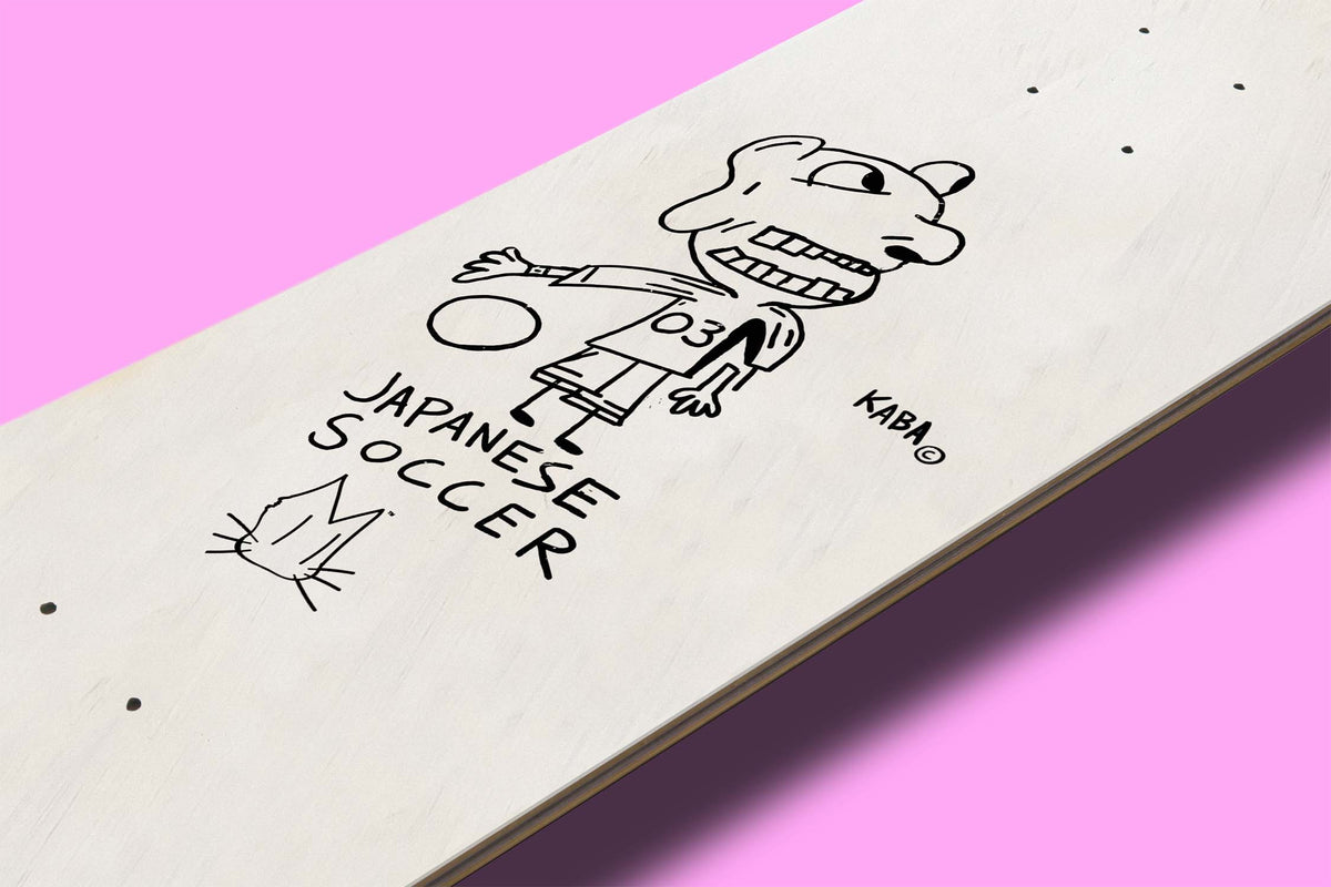 Made in Tokyo, Japan. Hand-painted skateboard deck on Canadian maple. White background with character artwork centered, acrylic with a matte finish. Designed for skating or display.