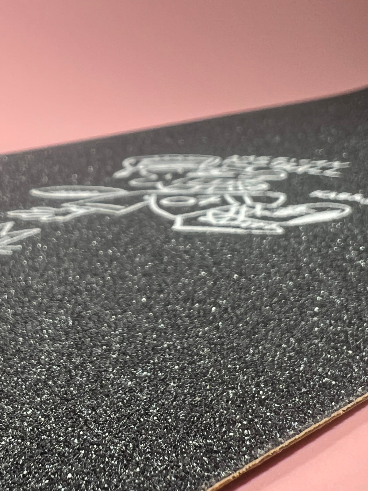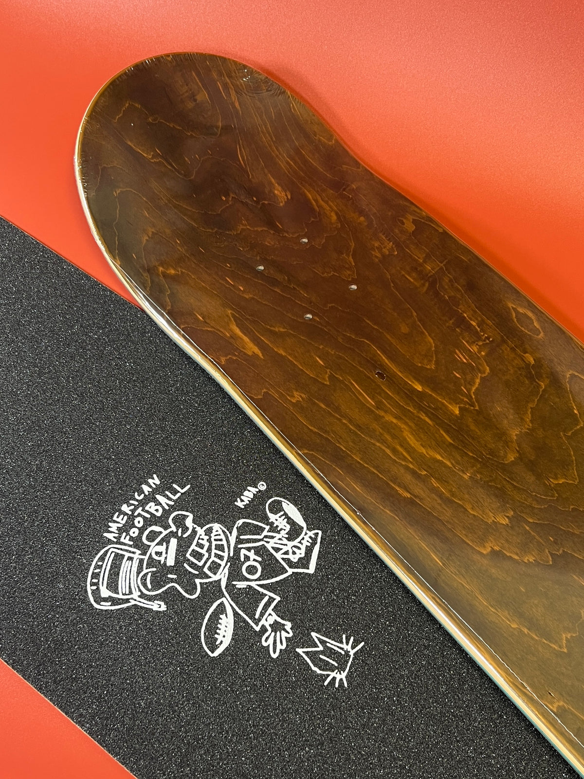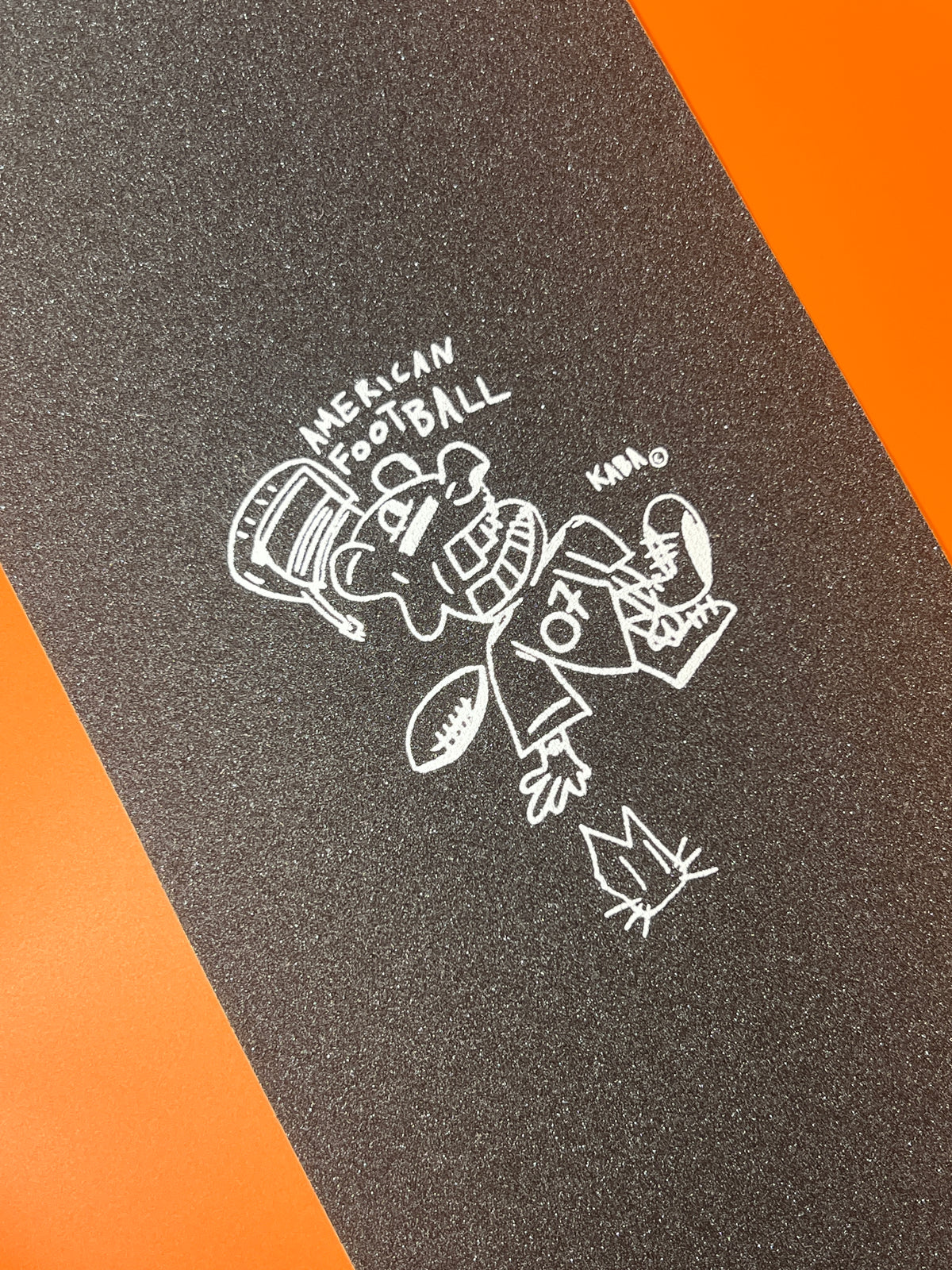 Classic skateboard griptape featuring a screen-printed American Football character. Size: 9 x 33 inches. Manufactured in Tokyo.