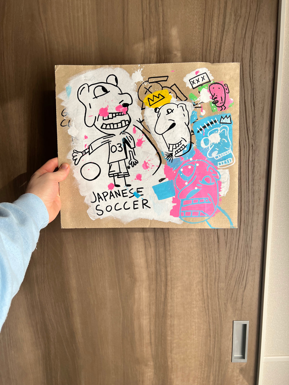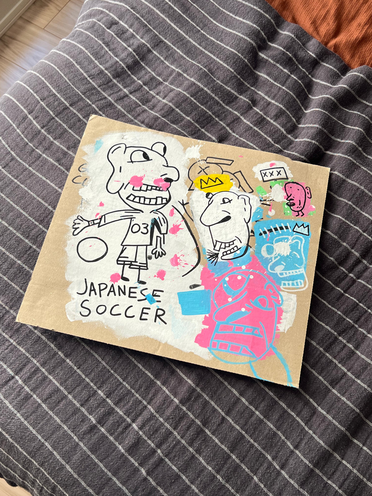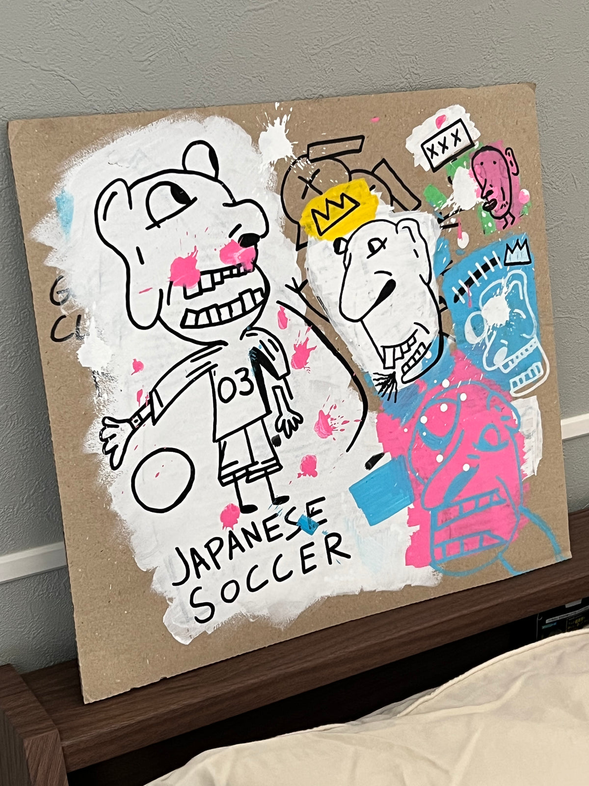 渋谷のサッカー場近くで拾った段ボールに描かれた「Japanese Soccer」は、素材の持つ生々しいシンプルさをそのままに、構図の中に混沌と個性を織り交ぜています。むき出しの段ボールの質感は、白いアクリル塗料の爆発的な効果によって分断され、自然な背景と描かれた要素の間に鮮やかなコントラストを生み出しています。