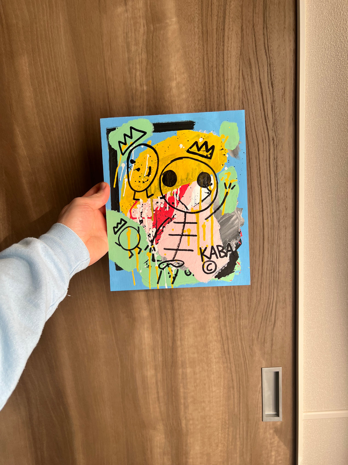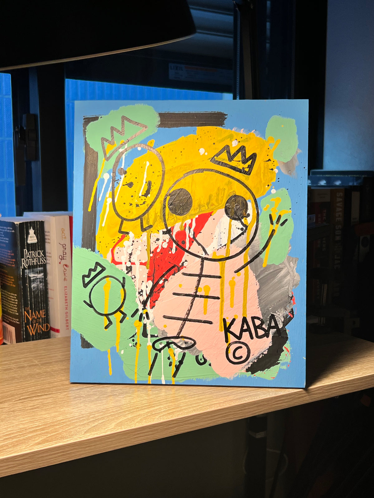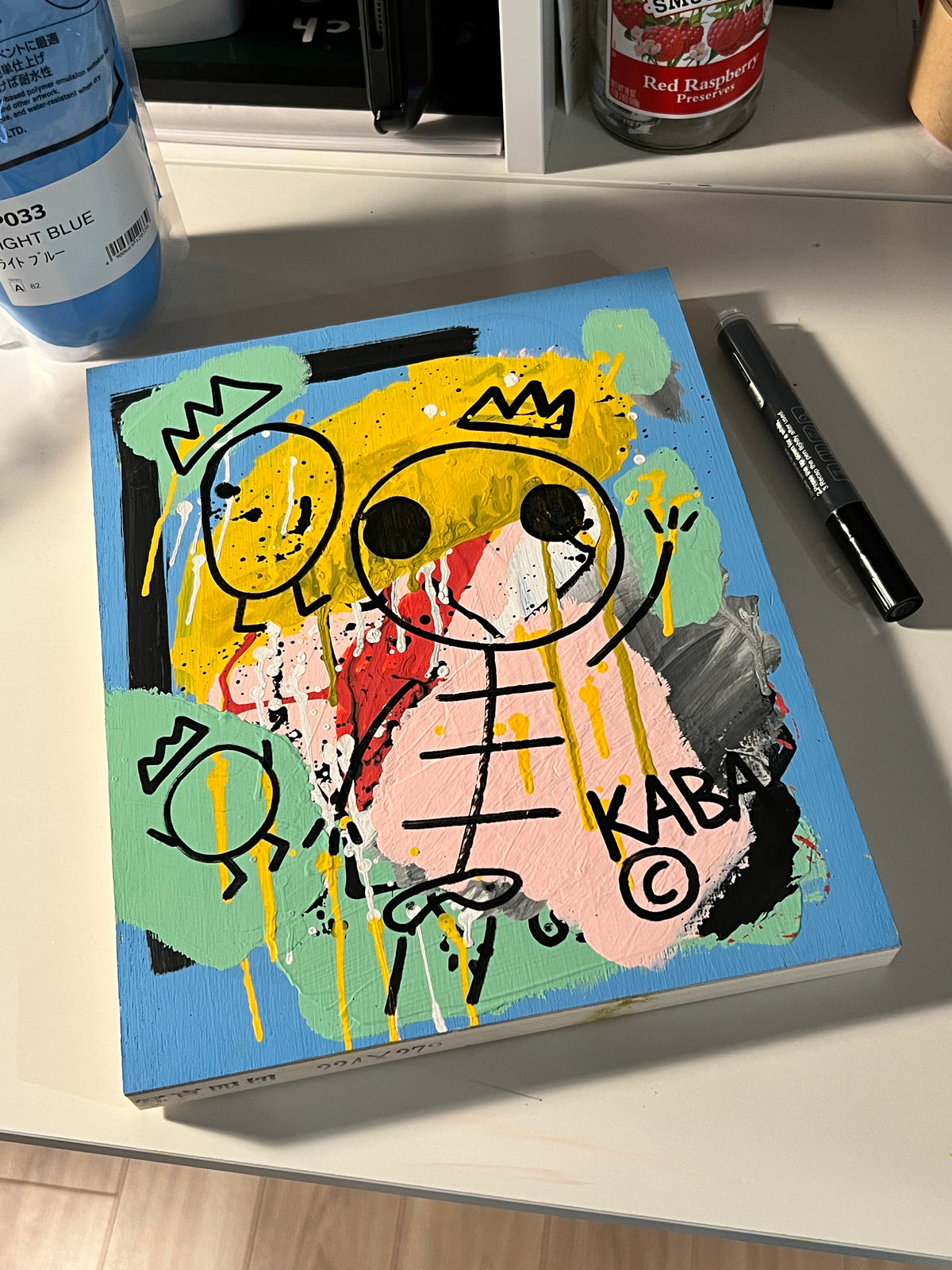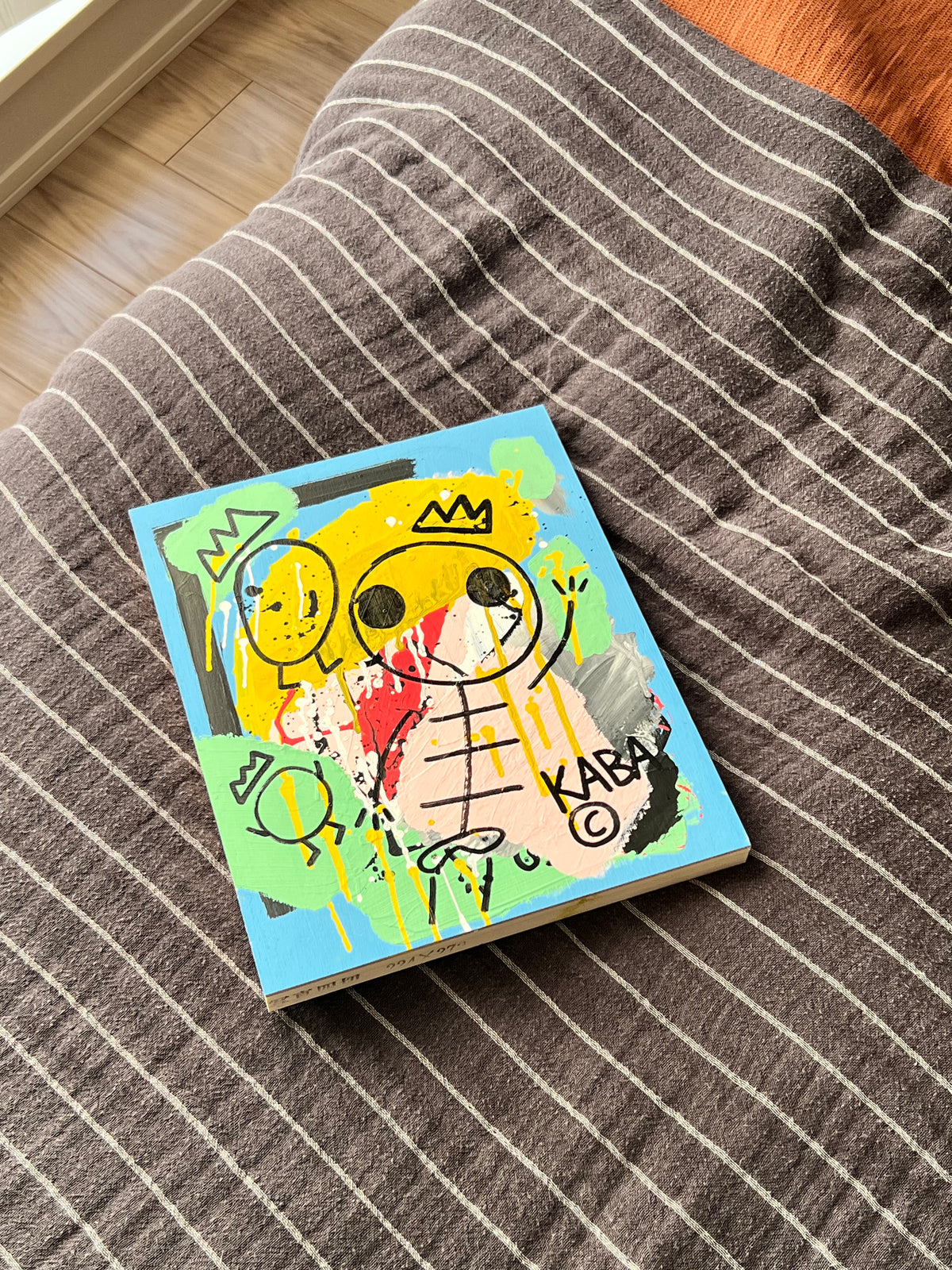 Featuring Skeleboy, Stone, and King Blueberry, each outlined in black acrylic marker, this painting captures a sense of depth and movement, as if the characters are drifting in a living, breathing reef. The pink undertones and luminous blues make this piece perfect for a coastal-inspired space, a bedroom, or anywhere that embraces the essence of the ocean.